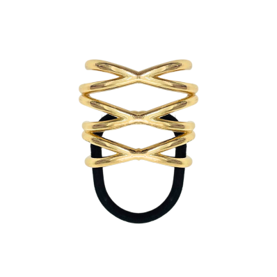Elástico enfeitado que entrega tudo! A peça em metal dourado é construída por 6 arcos que formam um desenho cruzado, como se o cabelo estivesse envolvido por uma fita. Uau! |